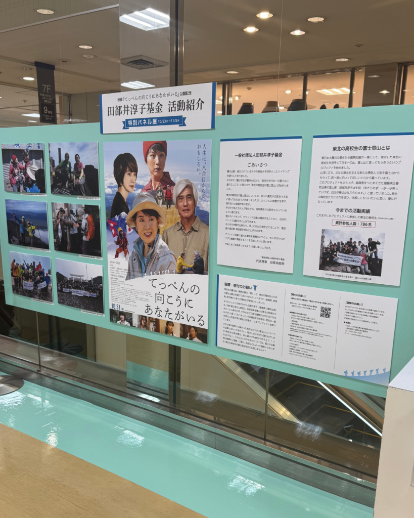 青年期の多部純子役(田部井淳子さん)を演じたのんが着用した衣装や田部井淳子基金についてのパネルが展示中。
